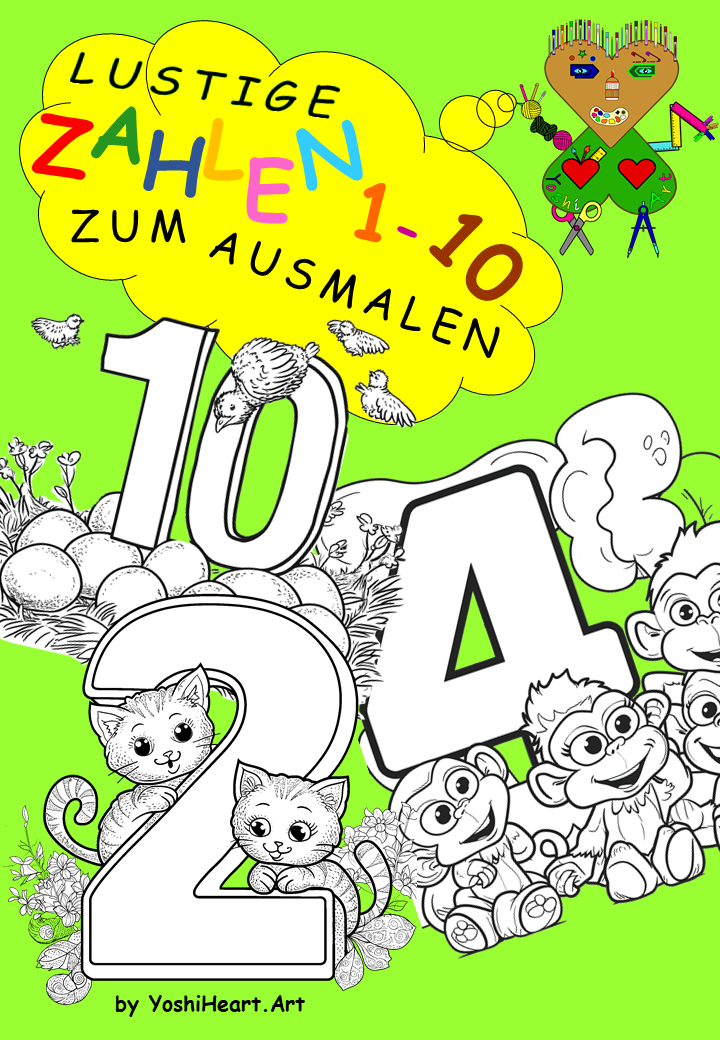 In diesem wunderbaren Ausmalbuch findest du die Zahlen von 1-10 in lustigen Formen, die mit Tieren, Gegenständen und vielem mehr verbunden sind.