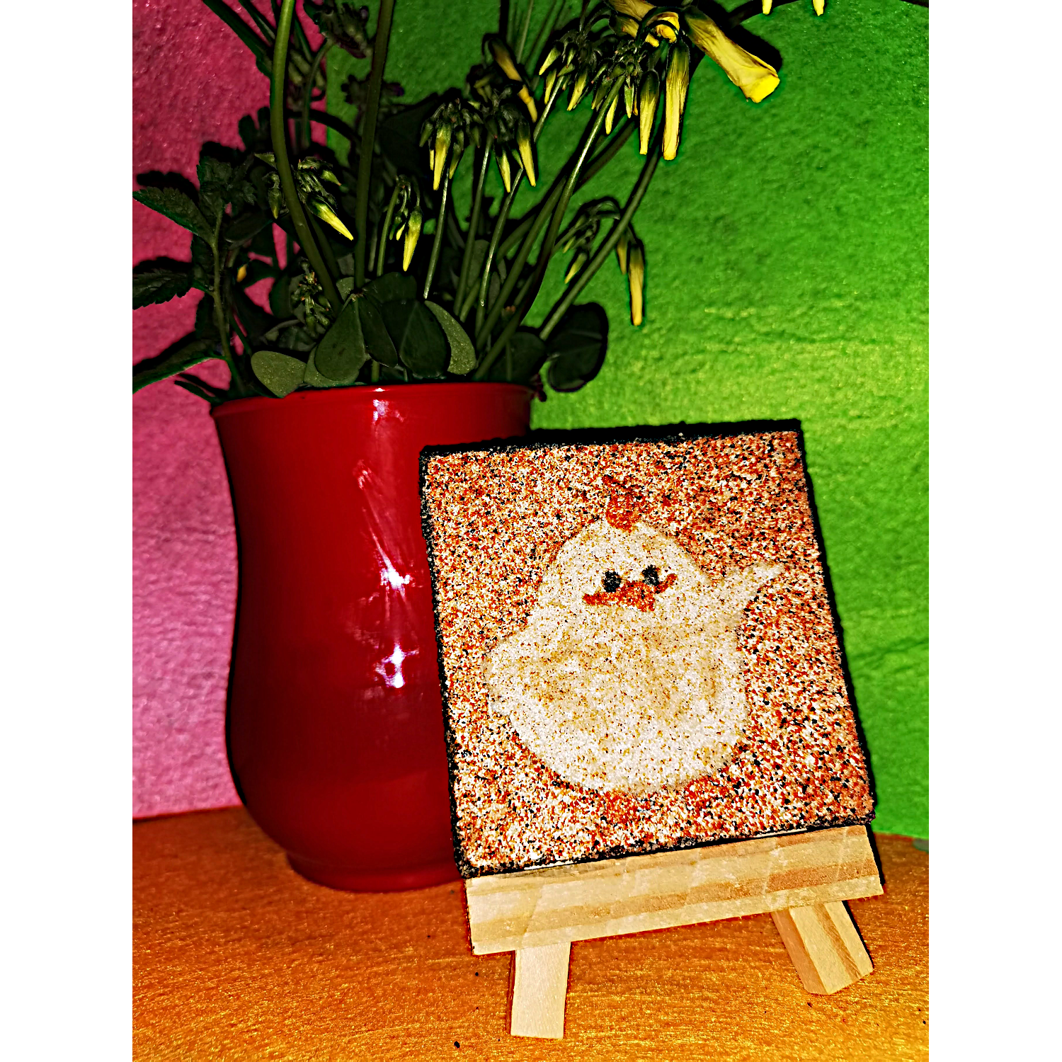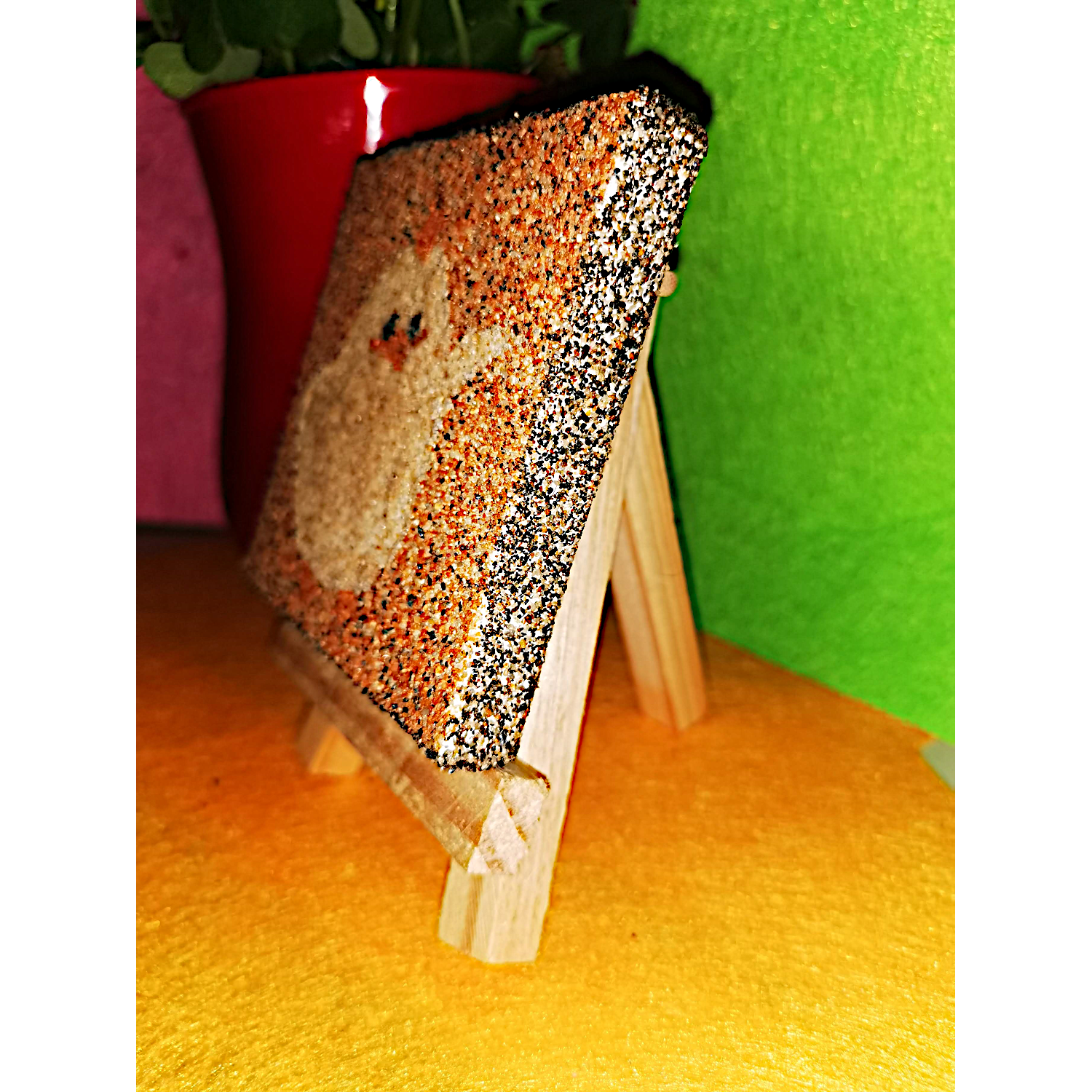 auf kleiner Staffelei, mit selbst gesammelten Sand von unterschiedlichen Stränden und zwei Händen erstellt.